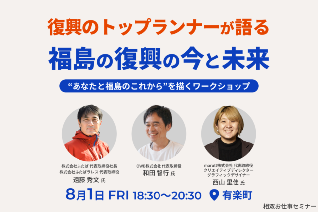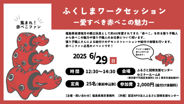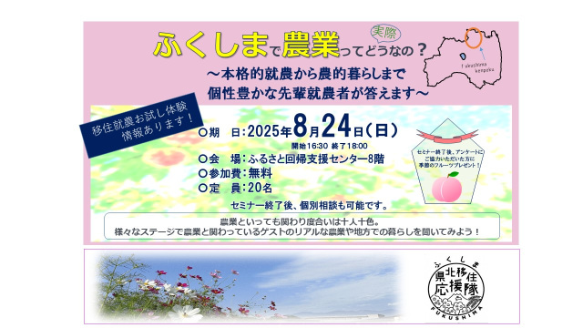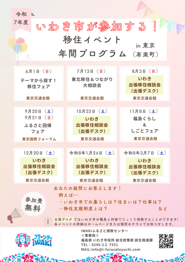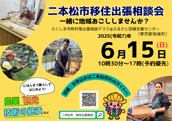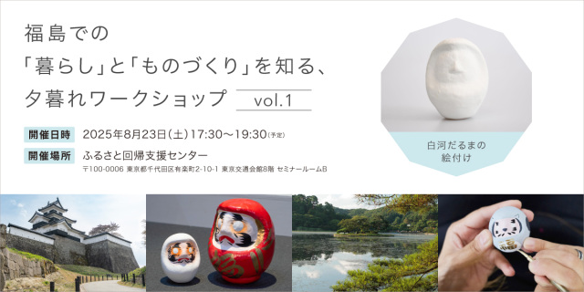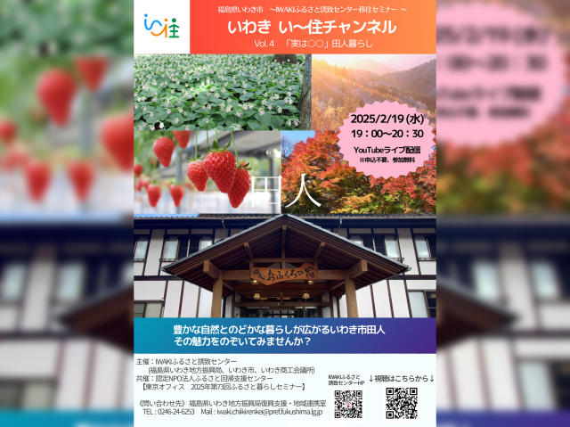 インフォメーション 移住イベント お知らせ もっと見る もっと見る ジモトが恋しい人集合~!! 「ジモト×ジブン」 いわきを語る会 2026年2月28日(土)13:00~15:00 会場(首都圏) 浜通り https://www.fukushima-iju.jp/event/detail_375.html 地域おこし協力隊『合同募集説明会』2026年1月25日@東京交通会館 2026年1月25日(日)11:00~15:30 会場(首都圏) 福島県(広域) https://www.fukushima-iju.jp/event/detail_384.html 【募集中】会津若松市おためし協力隊ツアー 2026年1月15日~2026年1月17日 現地(福島県) 会津 https://www.fukushima-iju.jp/event/detail_383.html 「会津若松市のくらしトークイベント&移住相談会」を開催します! @東京交通会館 会場(首都圏) 会津 https://www.fukushima-iju.jp/event/detail_382.html 【白河市】「栃木県那須町」×「福島県白河市」合同移住セミナー開催 in 東京(「那須と白河」で暮らすライフスタイル提案会) 2026年1月17日(土)13:00~15:30 会場(首都圏) 中通り https://www.fukushima-iju.jp/event/detail_381.html 【会津美里町】第9回地域おこし協力隊全国サミットに出展します! 2026年2月1日(日) 会場(首都圏) 会津 https://www.fukushima-iju.jp/event/detail_380.html 1/24㈯開催!ふくしまファンクラブ会員限定交流イベント「ふくしまワインとマリアージュnight」 2026年1月24日(土) 会場(首都圏) 福島県(広域) https://www.fukushima-iju.jp/event/detail_374.html 食と放射能に関する座談会 in 相馬市! 2025年12月14日(日)11:00~15:00 現地(福島県) 浜通り https://www.fukushima-iju.jp/event/detail_370.html 「ふくしまでマルチワークをはじめよう オンライン説明会」を開催します! 2025年12月12日(金)19時00分~20時00分 オンライン 福島県(広域) https://www.fukushima-iju.jp/event/detail_369.html 【オンライン開催】先輩が語る「二拠点生活」 その始め方と成功のヒケツ 〜暮らしが広がる、もう一つの”拠点”〜 2025年12月3日(水)19:00~20:30 オンライン 福島県(広域) 浜通り https://www.fukushima-iju.jp/event/detail_366.html ローカルシフトFUKUSHIMA https://www.fukushima-iju.jp/news/detail_146.html ふくしまと関わるRoom!~福島県関係人口ポータルサイト~ https://www.fukushima-iju.jp/news/detail_77.html 暮らしのお役立ちコラム https://www.fukushima-iju.jp/news/detail_62.html ふくしまぐらし。×テレワーク支援補助金 https://www.fukushima-iju.jp/news/detail_49.html 転職なき移住なら、ふくしま https://www.fukushima-iju.jp/news/detail_33.html ふくしまファンクラブ会員募集中! https://www.fukushima-iju.jp/news/detail_32.html