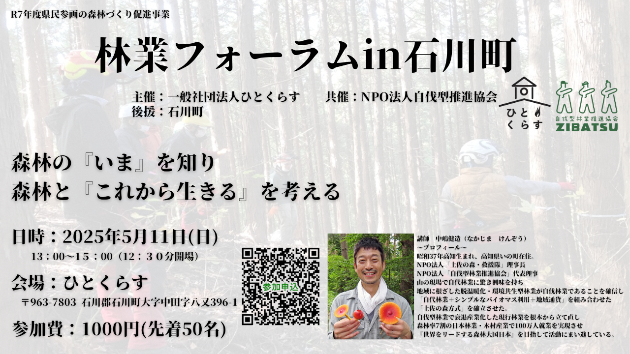 【5/11(日)】林業フォーラムin石川町 が開催されます!! 森林の『いま』を知り森林と『これから生きる』を考えてみませんか?? ■日時 5月11日(日)13:00~15:00 ■会場 ひとくらす(福島県石川郡石川町大字中田字八又396-1) ■参加費 1,000円(先着50名) 開催日 2025年5月11日(日) 林業 座談会 現地(福島県) 林業フォーラムin石川町 関連資料