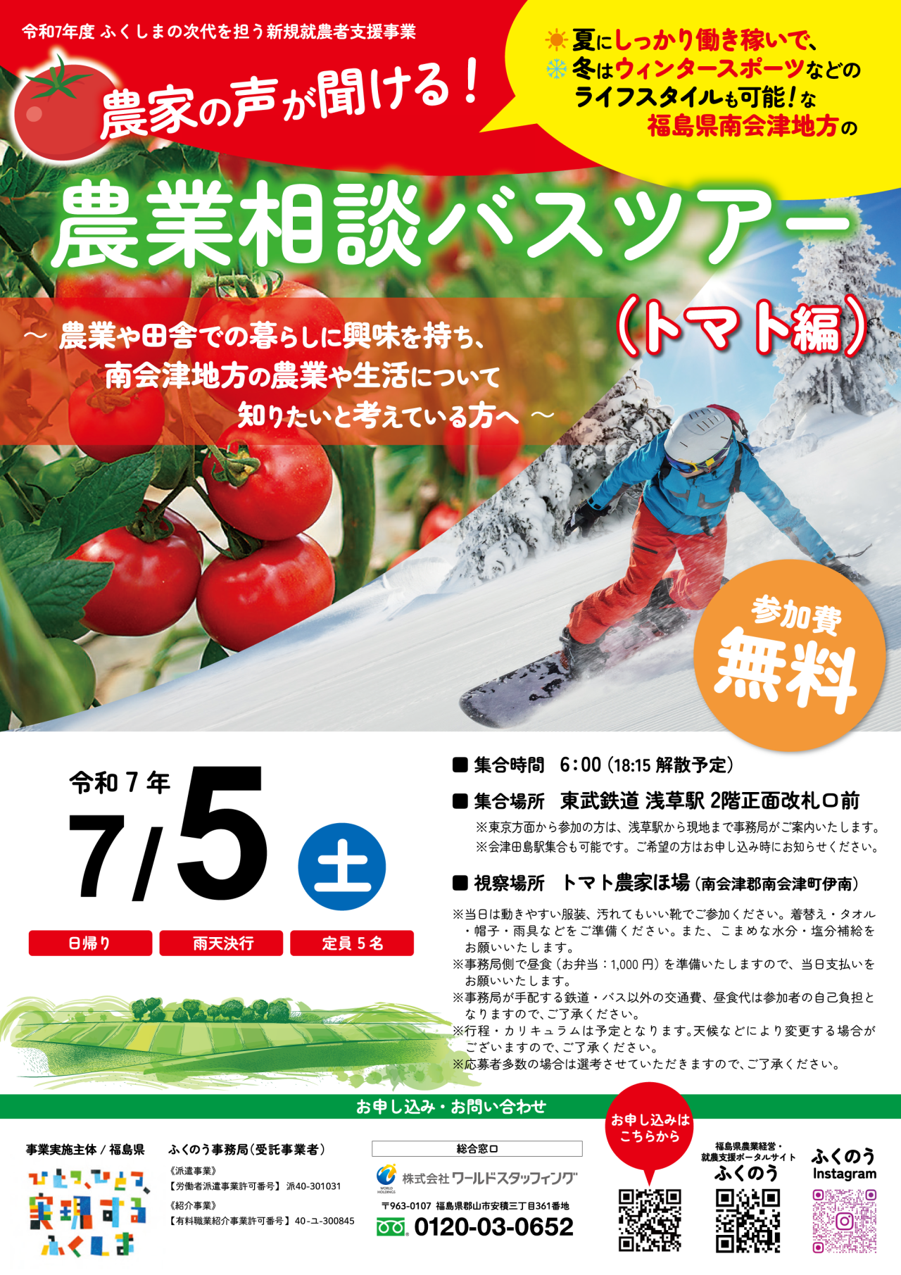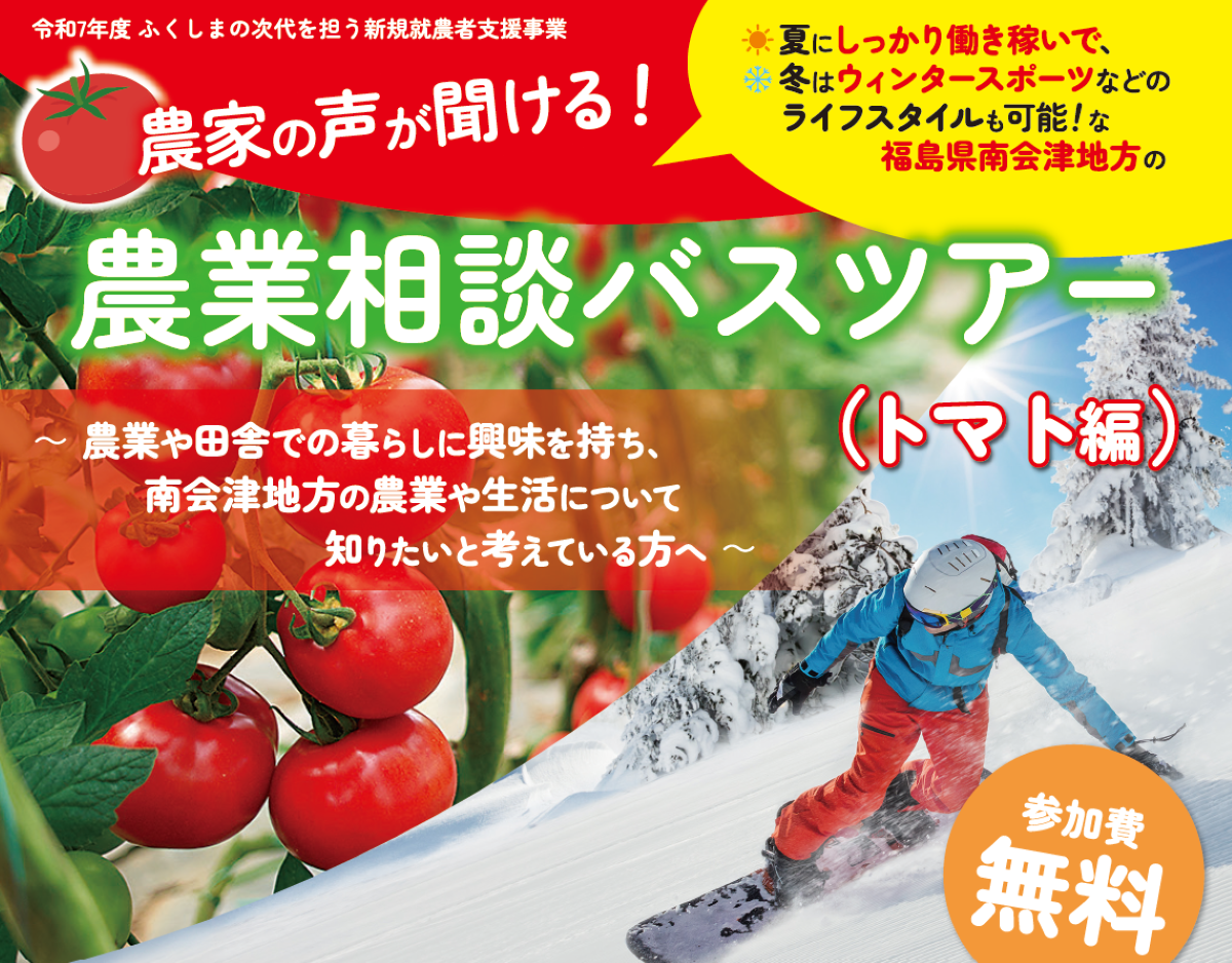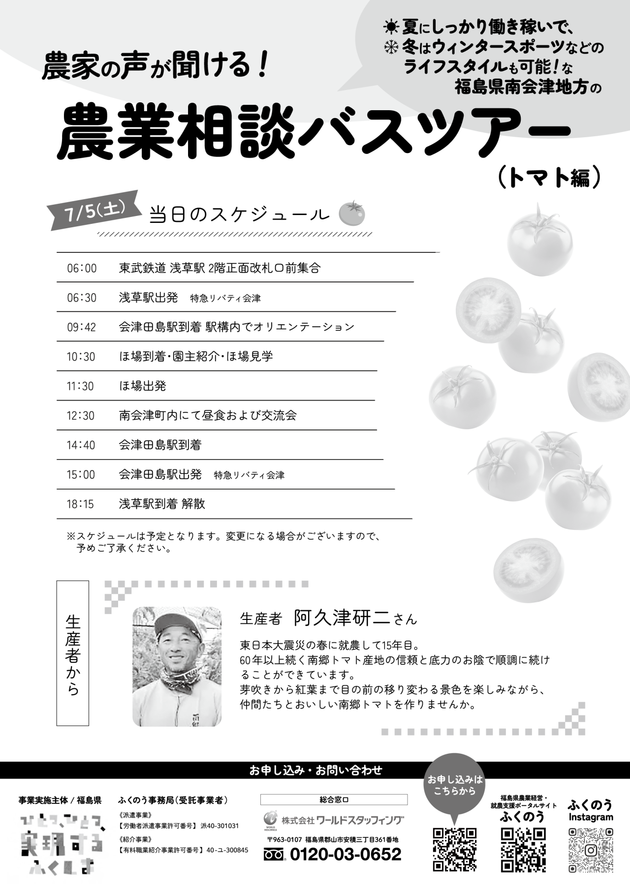 今回は、南会津地域の特産品で地理的表示保護制度(GI制度)登録もされている「南郷トマト」の生産ほ場で農家の方のお話しが直接聞ける「トマトコース」となります。