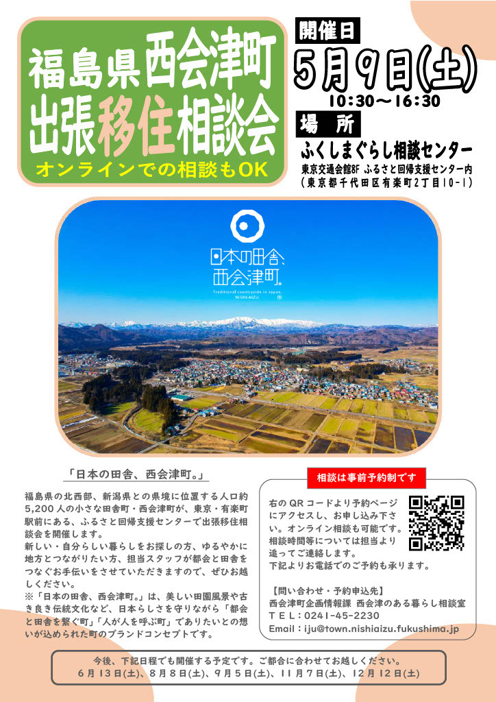 | 問い合わせ先 | 西会津町 企画情報課 西会津のある暮らし相談室 (電 話)0241-45-2230 (メール)iju@town.nishiaizu.fukushima.jp |