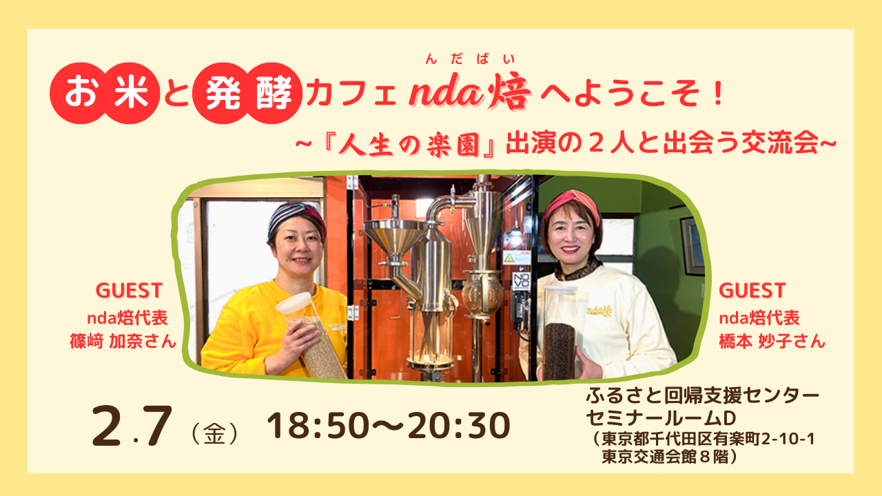 お米と発酵カフェnda焙(んだばい)へようこそ!~『人生の楽園』出演の2人と出会う交流会~