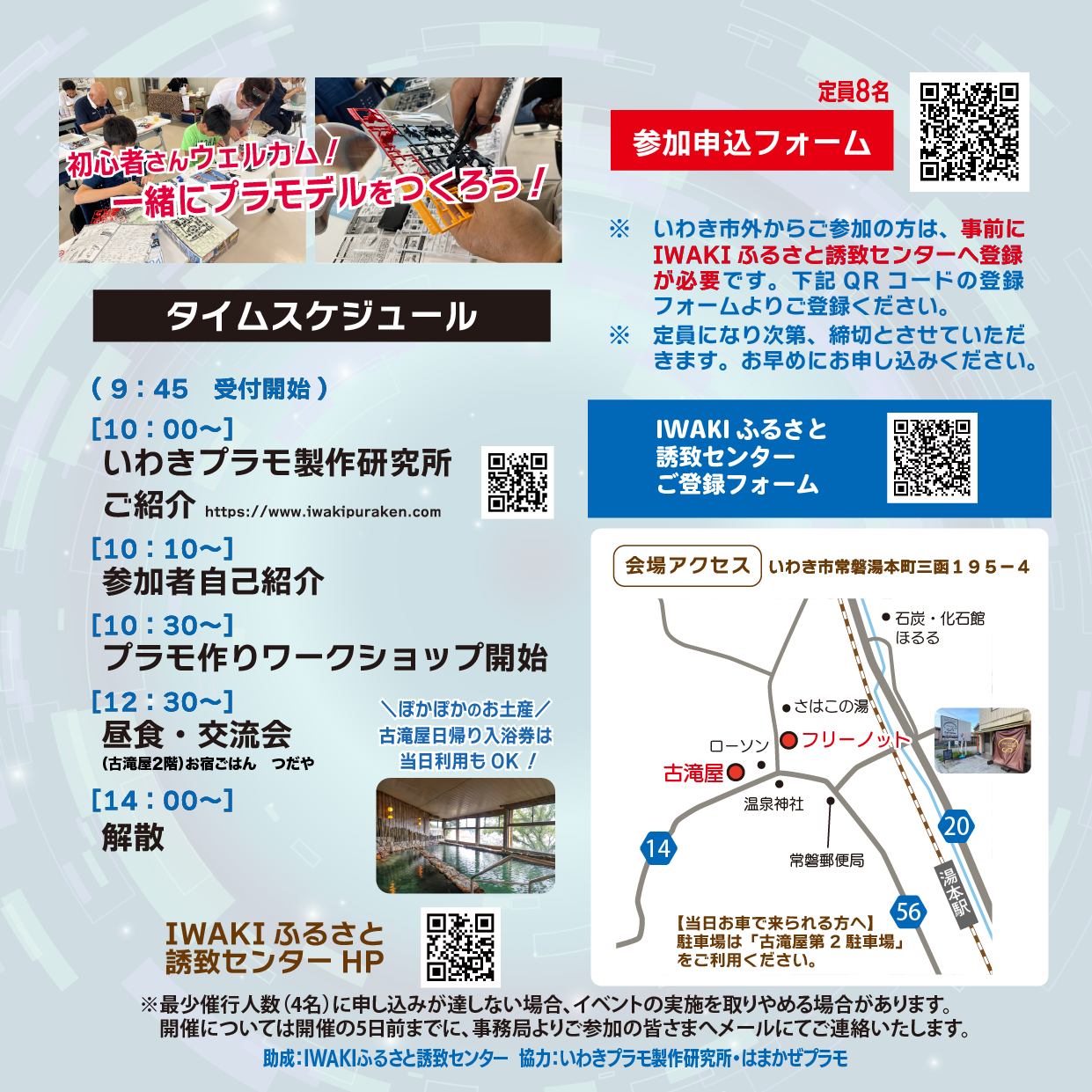 | 内容 | ・いわきプラモ製作所の紹介 ・プラモ作りワークショップ ・いわきらしさ満載の美味しいランチ (昼食会場:古滝屋2階「お宿ごはん つだや」) ・老舗温泉旅館「古滝屋」の入浴券のお土産 |