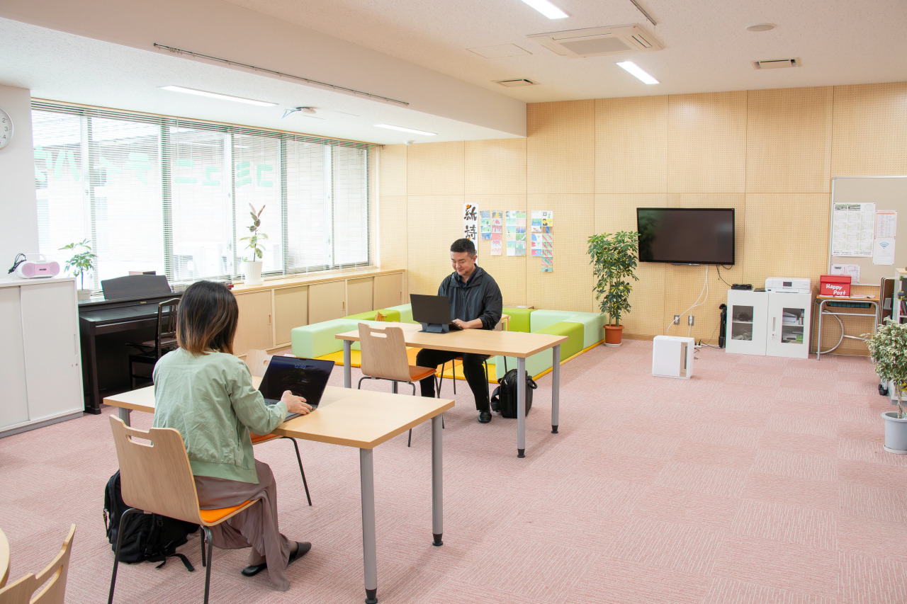 フリーWifi。フリードリンク。義務教育学校である川内小中学園内に併設されたコミュニティスペース。学校と地域の共有スペースであるため、生徒が利用したり、地域の方々が利用したりと、様々な交流が生まれるよう、社会教育的な側面も兼ね揃えた設計がなされています。スペース内には管理人が常駐しているため、どなたでも安心して利用が可能です。