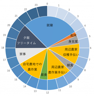 小山さんの移住前後の違いとしては、就寝時間と起床時間が大幅に早まった点ですね。農業の仕事のため、朝の早い時間帯に作業することが多いようです。今は周辺農家の収穫や農作業の手伝いを行いながら、自宅農地に植えたばかりの約130本の桃の苗木の手入れを行なっているようです。