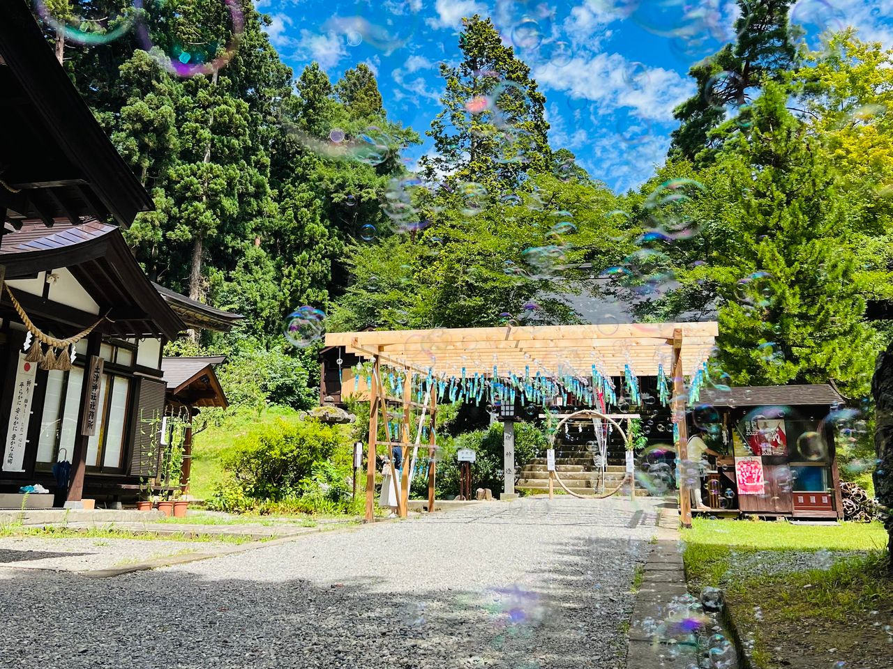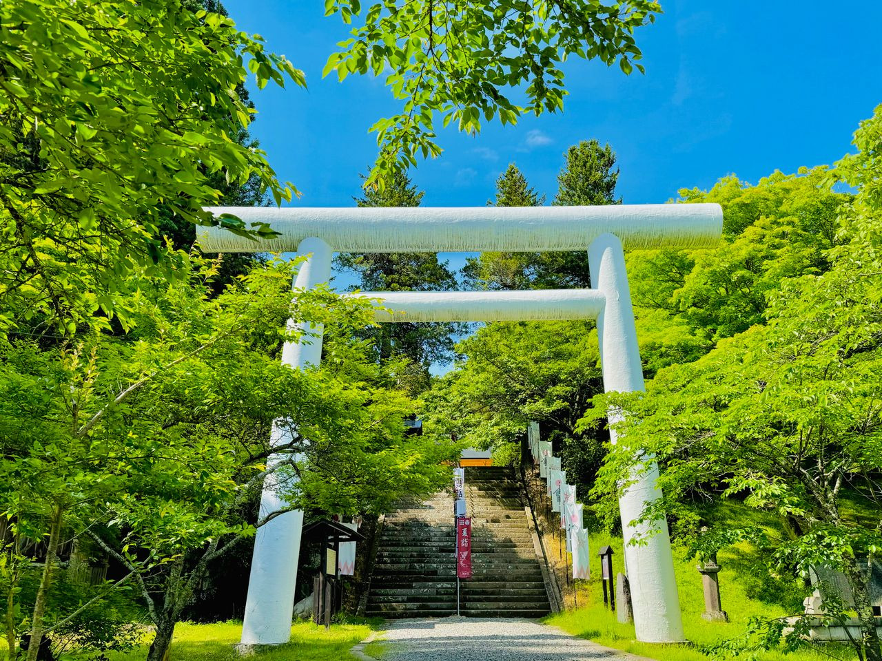 参拝者を迎える純白の大鳥居と、磐梯山の麓の自然に包まれた空気が、訪れる人の心をすっと整えてくれます。