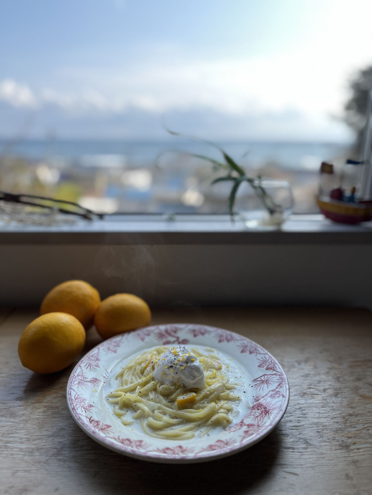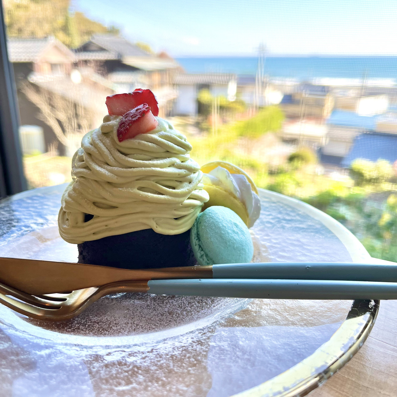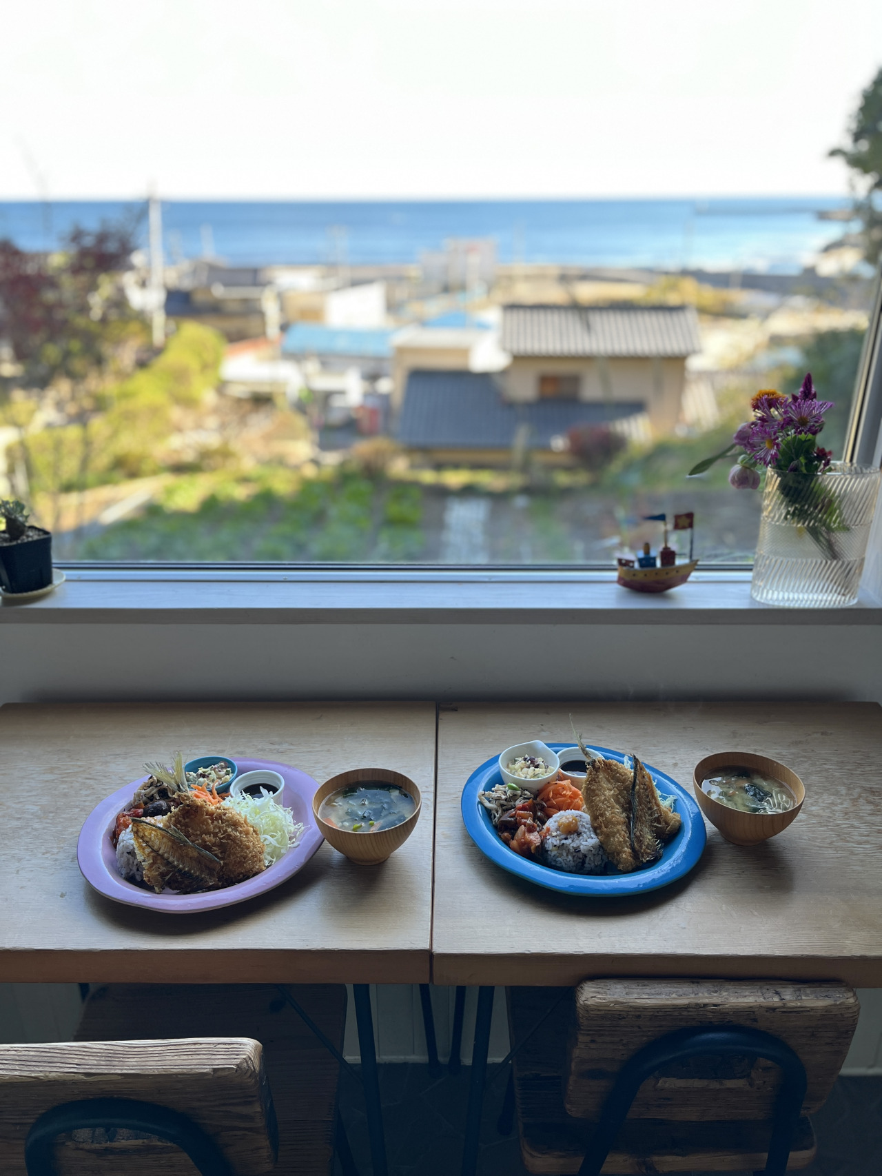 窓一面に広がる青い水平線を眺め、地元の旬を味わう。