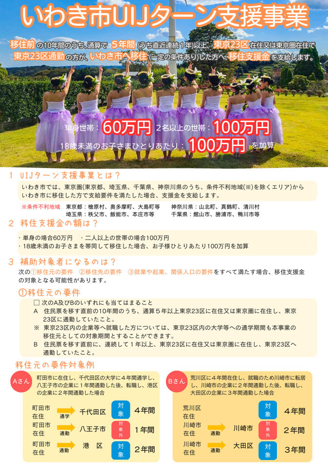 東京圏(東京都、埼玉県、千葉県、神奈川県のうち、条件不利地域を除くエリア)からいわき市に移住した方で交付要件を満たした場合、支援金を交付します。