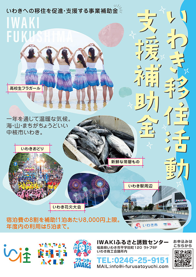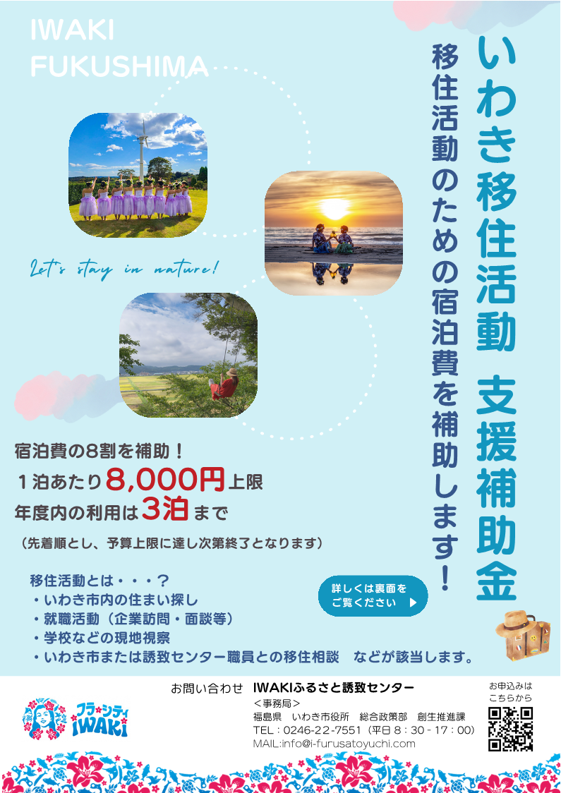【いわき市】いわき移住活動支援金 移住希望者の方々が仕事探し、住まい探し、移住に関する相談・生活環境調査等の活動を目的としていわき市に滞在する際の宿泊費の一部を補助するものです。 住まい しごと 相談 〇対象経費 宿泊費の8割〇補助上限額 8千円/泊〇利用上限日数 一人あたり3泊まで(年度)